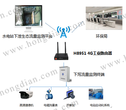 针对以上问题宏电提供基于4G 路由器无线通信的水电站下泄生态流量在线监测方案,宏电H8951 4G路由器接入下泻流量监测终端,通过4G高速无线网络实时将监测终端采集到的水位、流量、现场视频图像、水电站运行状态信息实时上传到水电站下泄生态流量平台和环保局,监管部门可远程进行实时的数据采集与设备控制,随时掌握各水电站的流量下泄情况。