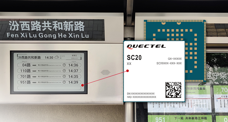 这类电子墨水屏站牌由上海祺壹智能科技有限公司基于移远智能模组SC20深化系统设计,以稳定可靠的无线通信能力,来实现与公交数据服务中心之间的实时通信。电子墨水屏站牌可从数据服务中心获取公交车的实时位置、速度等信息,基于此类信息对公交车的到站时间做出预测,让候车的乘客做到心中有数,能帮助市民更合适地安排时间,缓解人们等公交时焦躁不安的情绪。