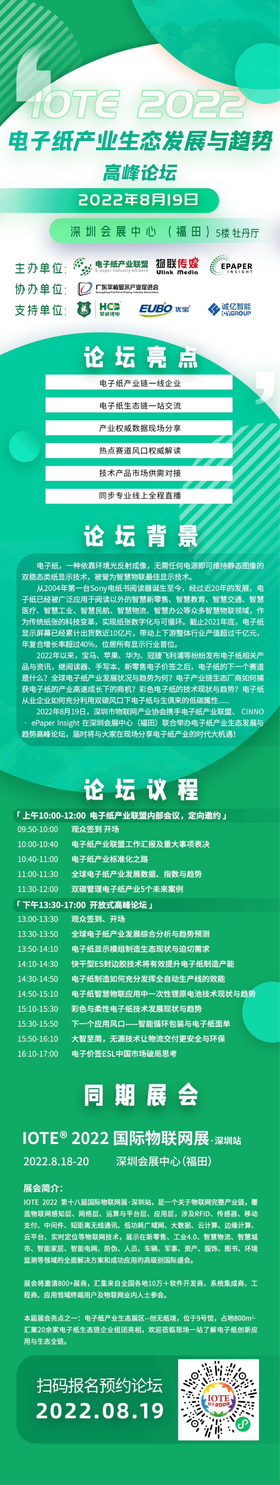 2022年8月19日,深圳市物联网产业协会携手电子纸产业联盟、 CINNO ePaper Insight 将联合举办电子纸产业生态发展与趋势会议!