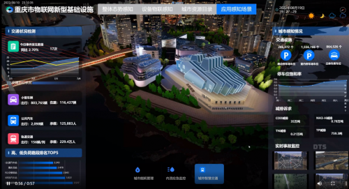 其中重庆市物联网新型基础设施页面以重庆来福士广场为中心进行三维数字城市展示,从能耗监测、内涝监测、交通管理等方面分别展现智慧城市从物联到数联到智联,给观众带来智慧城市沉浸式体验。通过仿真天气模拟,雨情防涝预警,事件趋势分析,交通预警等技术,支撑城市能耗管理、内涝应急监控、智慧交通等智联应用场景,实现城市治疗全流程态势数字化、智能化、可视化管理,助力城市精细化管理。