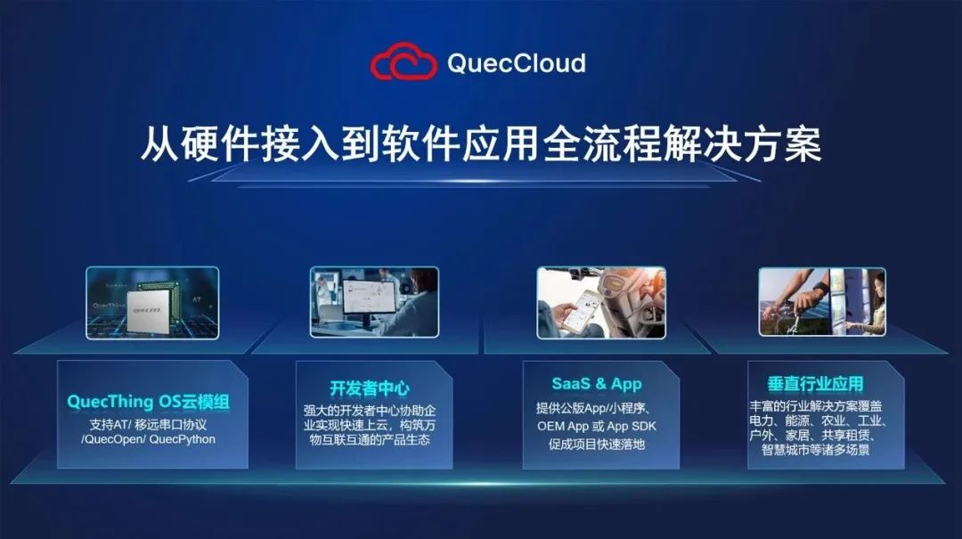在物联网系统开发中,“设备上云”一直是必备但不可忽略的技术难点。基于此,移远推出自研云平台QuecCloud,打造了“终端+连接+平台+应用”的端到端一站式服务,从智能硬件到开发者平台、SaaS &App、行业解决方案,助力通用设备、商用设备、户外出行、智能家居等行业的客户产品快速实现智能化。截至目前,移远云已经累计服务了500多家行业客户。