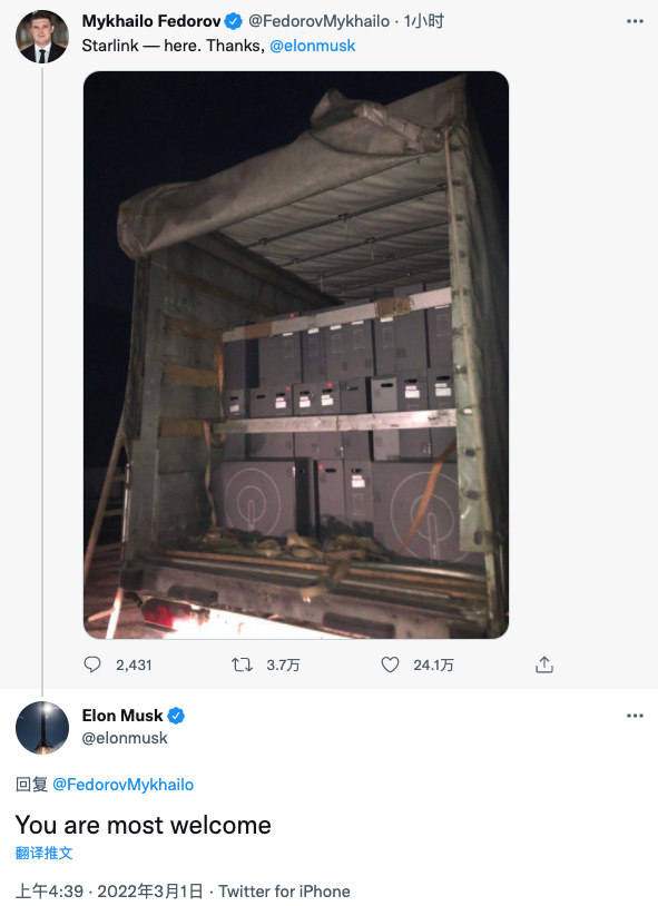 上周末,米哈伊洛 费多罗夫 (Mykhailo Fedorov) 在 Twitter 上发文,要求他为乌克兰提供星链站。作为回应,马斯克表示,星链卫星互联网服务已经为该国启用,并将提供更多终端。