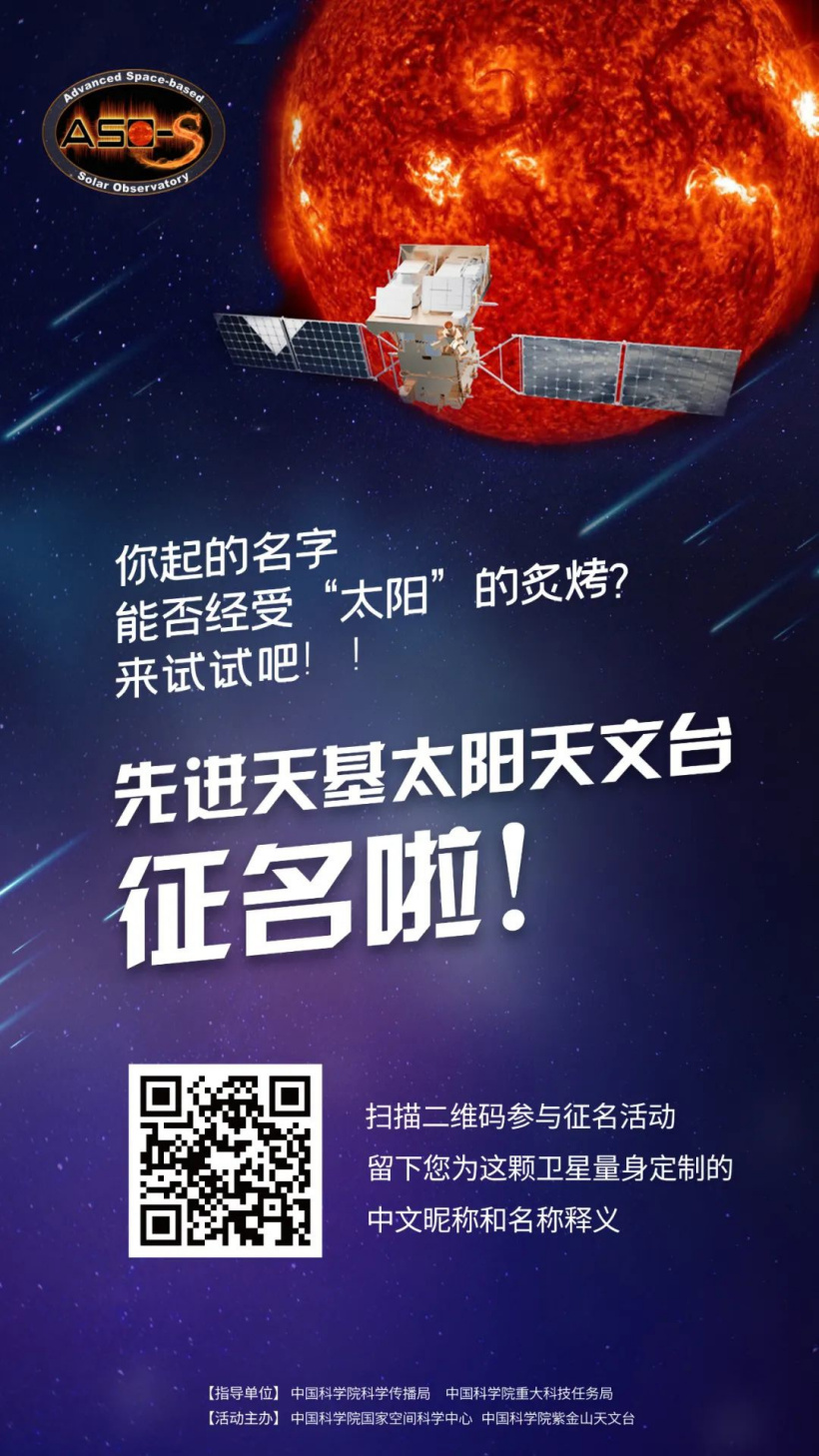 据中国科学院国家天文台官微,即将发射的“先进天基太阳天文台(Advanced Space-based Solar Observatory,简称 ASO-S)”今日开启中文昵称和名称释义征集活动,征集时间为 2022 年 7 月 11 日至 24 日。