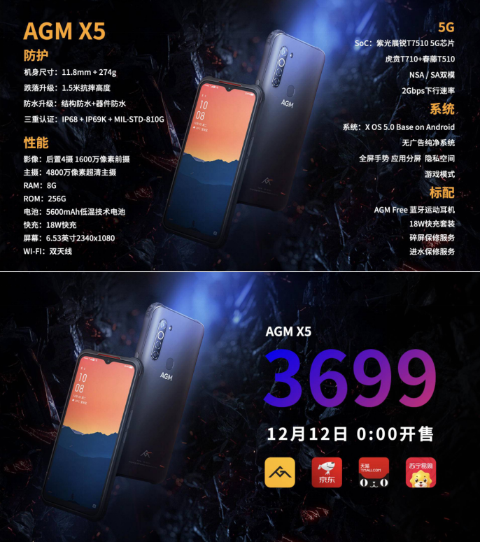12月12日,AGM X5将在官网、京东、天猫等电商平台,全渠道开售,3699元。