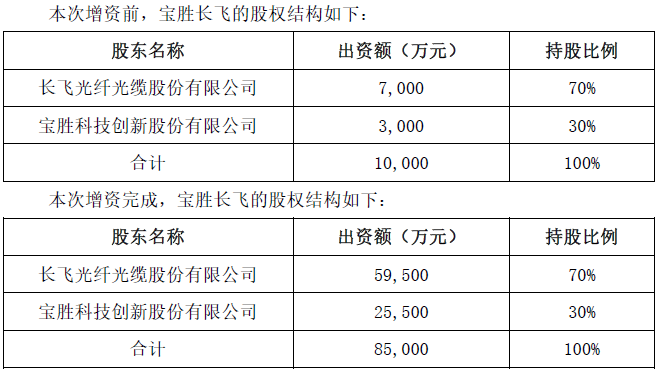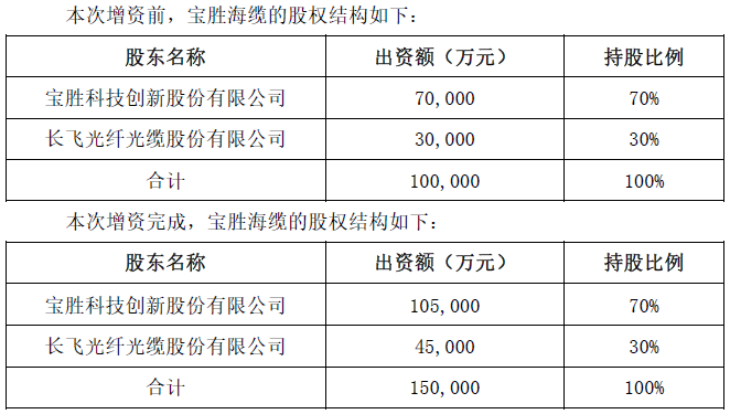 其中,宝胜股份拟增资35,000万元,长飞光纤光缆股份有限公司(以下简称“长飞公司”)拟增资15,000万元。增资完成后,宝胜海缆的注册资本为150,000万元,其中宝胜股份持股70%,长飞公司持股30%。