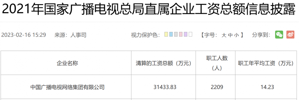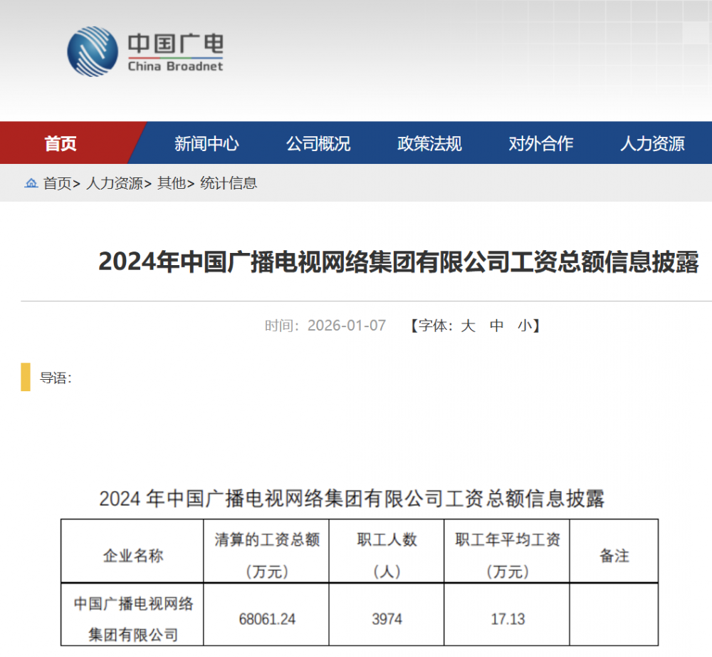C114讯 2月13日消息(颜翊)近日,中国广电首次通过其官网主动披露2024年度工资总额信息。数据显示,2024年中国广电职工年平均工资为17.13万元,较2023年的16.07万元上涨6.6%。
