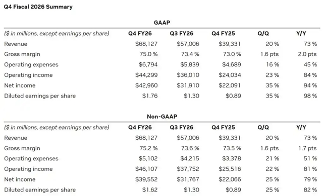 C114讯 2月26日消息 当地时间2月25日美股盘后,英伟达发布了截至2月25日的2026财年第四财季财报,期内实现营收681.27亿美元,同比增长73%,高于市场预期的658亿美元;美国通用会计准则(GAAP)下净利润429.60亿美元,同比增长94%;Non-GAAP下每股摊薄收益为1.62美元,同比增长82%,超出市场预期的1.53美元。