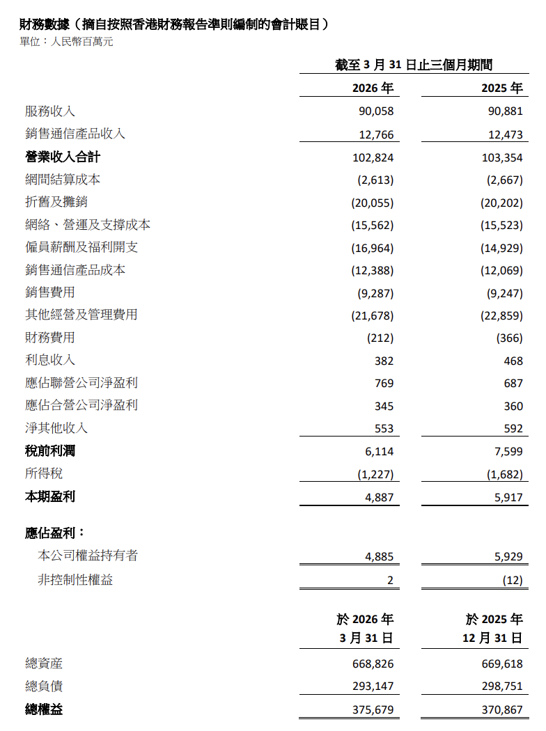 C114讯 4月21日消息(颜翊)今日,中国联通公布了2026年首季度主要财务及经营指标,一季度,公司营业收入人民币1,028亿元,同比下降0.5%;税前利润人民币61亿元,本公司权益持有者应占盈利人民币49亿元,同比下降17.6%。