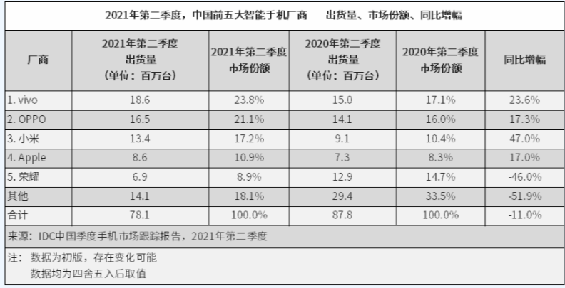 今日,国际数据公司(IDC)手机季度跟踪报告显示,2021 年第二季度中国智能手机市场出货量约 7810 万台,同比下降 11.0%。