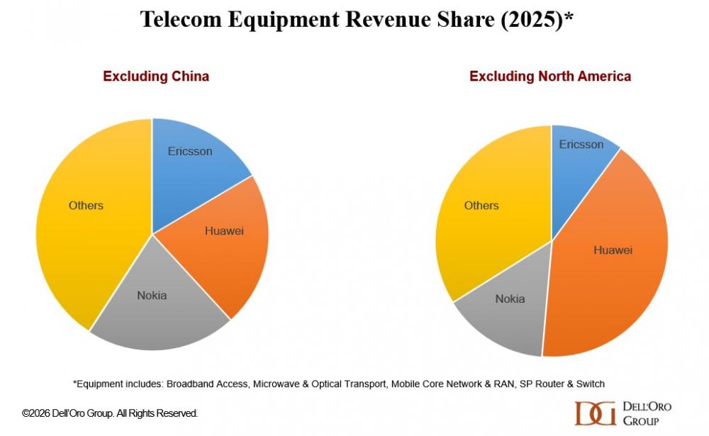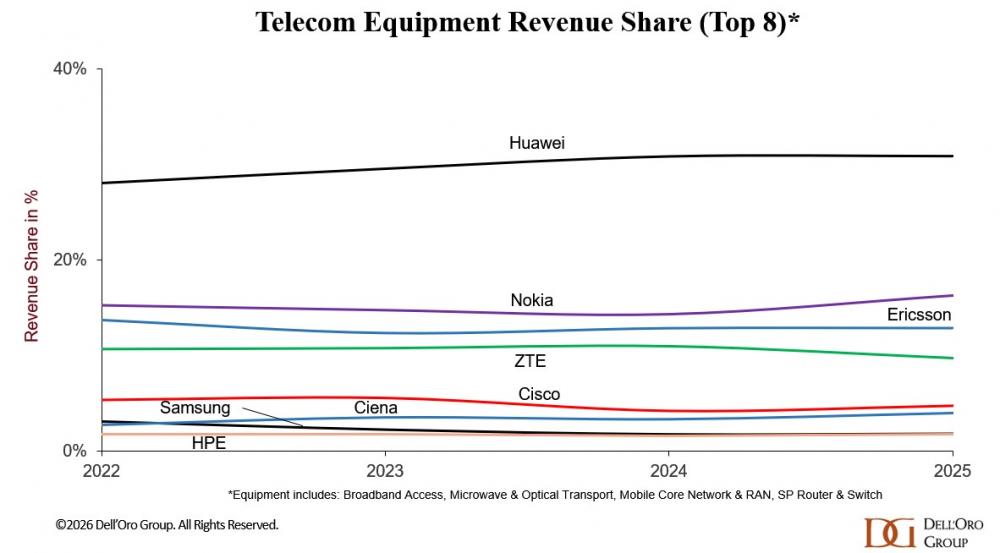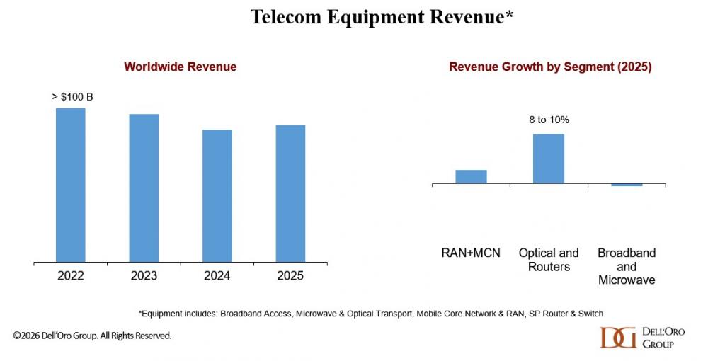 市场研究公司Dell'Oro Group的初步调查结果显示,2025年全球电信设备总收入同比增长了4%,其研究追踪涵盖了六大电信设备市场领域——宽带接入、微波与光传输、移动核心网、无线接入网RAN以及运营商路由器与交换机市场,这一增长得益于2025年第四季度的强劲增长(占全年收入的29%)。