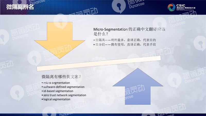 严雷谈到,如果从直译的角度说,相较于更被大家所熟知的“微隔离”而言,“微分段”应该是更恰当的翻译。因为它事实上很直观的指出了这个技术最朴素的一个含义,那就是把一个无结构无边界的网络分成好多逻辑上的微小网段,以确保每一个网段上只有一个计算资源,而所有需要进出这个微网段的流量都需要经过访问控制设备。但是,不知道什么原因,微分段的名字没有流传开,反倒是不那么准确的微隔离流传开了。严雷认为,似乎可以这样理解,相较于直译的“微分段”,从意译的角度看,微隔离则更加准确。因为它准确地反映了这个技术的目的和价值,那就是在一个没有任何访问控制能力的网络中,创造出一个全面可控的零信任网络,从而让每一个资源都可以被逻辑地与其他资源隔离开。谈到这里,严雷指出,事实上网络安全产品一直就有两种命名方式。比如说漏洞扫描、杀毒软件、网页防篡改一类的名字就是很准确地阐述这个产品的功能。但是还有一类,比如防火墙、下一代防火墙、堡垒机这样的名字就没有直接对技术进行描述,但同时又很形象的反映了产品的价值和目的,因此也被人们认可和广泛使用。因此微隔离这个名字,虽然不是完全的准确,但也不妨碍其成为更加被大家所认可所接受的命名。