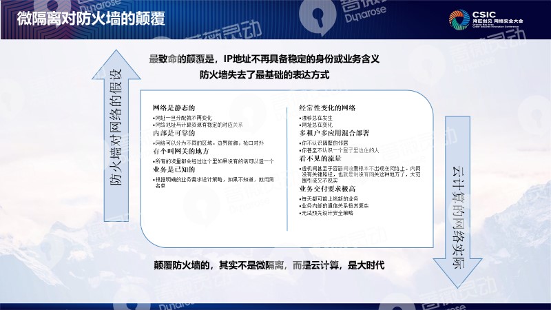 业界一直流传一句话,微隔离必将而且正在颠覆防火墙,那么这句话究竟反映了什么样的技术判断和发展趋势呢。严雷先生指出,颠覆防火墙的其实不是微隔离,而是云计算。防火墙有其诞生的历史背景,在防火墙被设计的时候,网络是静态的,IP地址具备稳定的身份属性,也就是说IP地址与资产之间具备稳定的一一对应关系,因此这个时候就出现了以IP地址作为基本表达方式的防火墙技术。但是随着云计算、物联网等基础设施的广泛部署,IP地址不再是一个被静态配置的常数,而是变成了一种池化的,动态分配的变量。换言之,IP地址不再具备资源的标识信息价值,而是作为一个通信用的临时性变量而存在。这带来一个非常重大的影响,那就是以IP地址为基本元语的防火墙失去了最核心的表达方式。取而代之的则是包括微隔离在内的以逻辑标识为基本元语的新一代网络安全技术。