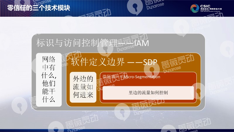 在介绍微隔离与零信任的关系时,严雷引用了Forester,Gartner,NIST的相关资料予以说明。可以看到,在各种权威机构的理论体系中,都把微隔离放在了一个核心的位置上,并与IAM技术,SDP技术一道构成了零信任领域的三个技术基石。而关于这三个技术彼此之间的关系,严雷给出了一个简单而生动的解答。IAM技术主要是回答网络中有哪些物理和逻辑的资源实体,以及这些资源之间彼此的访问关系授权。由于零信任技术的特点就是直接面向资源而不是面向网路的,因此就需要一个在全局生效的IAM体系,用以为SDP和微隔离技术提供策略基础。而SDP和微隔离技术的区别在于,SDP用以解决从数据中心外部(不再区分办公网和互联网)安全地访问数据中心的服务与数据的问题。而微隔离技术则用于解决数据中心内部流量的识别与访问控制问题。这两个技术就把数据中心全部流量(南北向,东西向)都管理起来了。