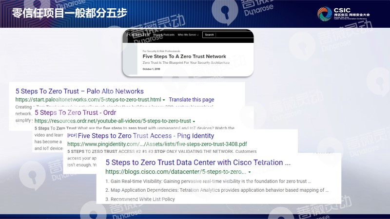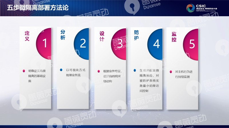当谈到微隔离的五步工作法时,严雷先生风趣地指出,当今做零信任,都是分五步,微隔离是五步,SDP也是五步,每个公司都是五步,不是五步就不正宗了。事实上,就连每一步的主要工作目标也都是相近的,只不过在于具体技术场景相结合时会有一些实现上的差异。