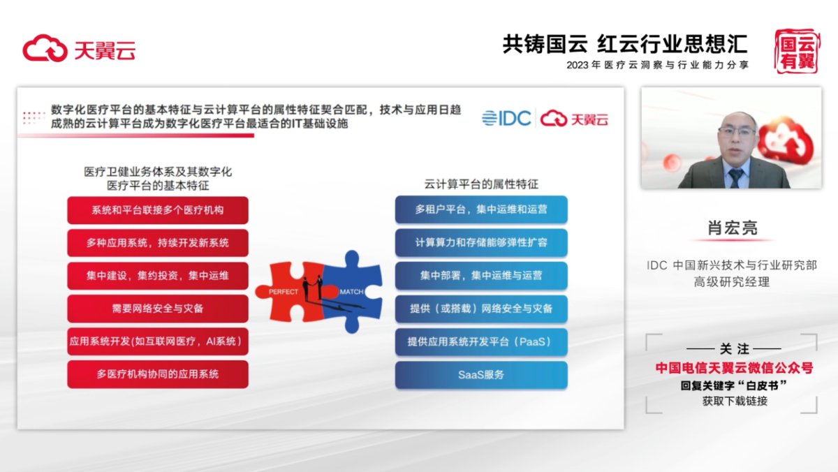 IDC中国新兴技术与行业研究部高级研究经理肖宏亮对白皮书进行解读。他表示,医疗行业云将发展成为医疗卫生业务运行的基础架构,促进全人群、全生命周期的卫生健康管理,支撑健康中国2030规划目标实现。