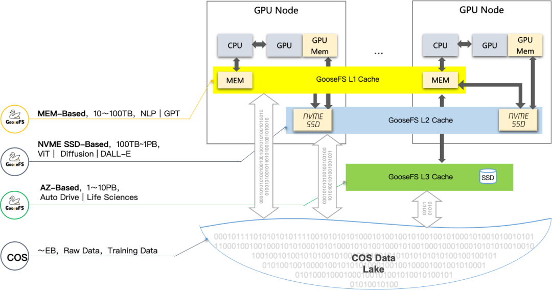 COS+GooseFS对象存储方案,提供多层缓存加速,大幅提升端到端的数据读取性能;将公开数据集、训练数据、模型结果统一存储到对象存储COS中,实现数据统一存储和高效流转。同时,GooseFS按需将热数据缓存到GPU内存和本地盘中,利用数据本地性提供高性能访问。