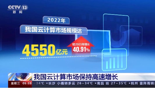 7月26日,CCTV-13《朝闻天下》对我国云计算市场规模和增速进行了报道。报道称,中国信息通信研究院发布的《云计算白皮书(2023年)》数据显示,2022年,我国云计算市场规模达4550亿元,较2021年增长40.91%。