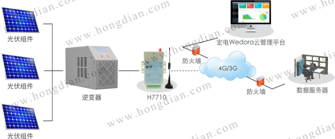 宏电光伏电站智能运维系统主要由光伏组件、汇流箱、逆变器、宏电4G DTU、宏电Wedora云平台等组成。将逆变器采集到的光伏组件电流电压数据通过4G DTU实时传输到电力数据服务器,实现发电量上传、故障工单管理和设备数据实时展示等基本管控。通过宏电Wedora云平台实现DTU设备的远程管理,及时发现设备故障并告警,依据损失影响大小,安排巡检与恢复,提高设备利用率,减少因故障带来的损失。