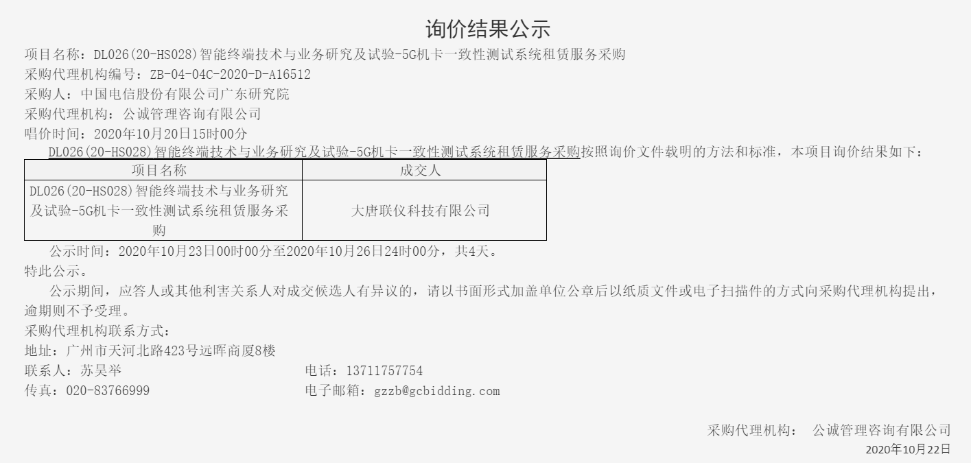 2020年10月,大唐联仪5G机卡一致性测试系统再次中标中国电信研究院终端测试验证项目。该测试系统能进行终端和智能卡的兼容性测试以及终端和芯片组的开发和功能性测试,可全面满足中国电信5G终端测试方法-机卡一致性分册的测试规范需求,遵循3GPP 31.121、31.124等对应要求,提供5G机卡一致性USIM和USAT测试能力,具备异常卡模拟的能力。同时,大唐联仪已经在GCF和PTCRB分别认证了机卡一致性测试系统TP304,并启动测试用例的认证工作。基于此测试系统可以进行GCF和PTCRB的认证测试。此次中标也代表大唐联仪再次得到了中国电信研究院和终端芯片厂商的充分认可。