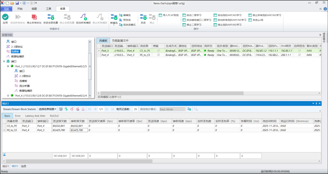 搭建简化的测试场景,在一对端口上模拟测试1000个MPLS IP VPN,每VPN通告100条VPNv4路由,并震荡其中10%路由。发送iMIX流量验证VPN转发能力。