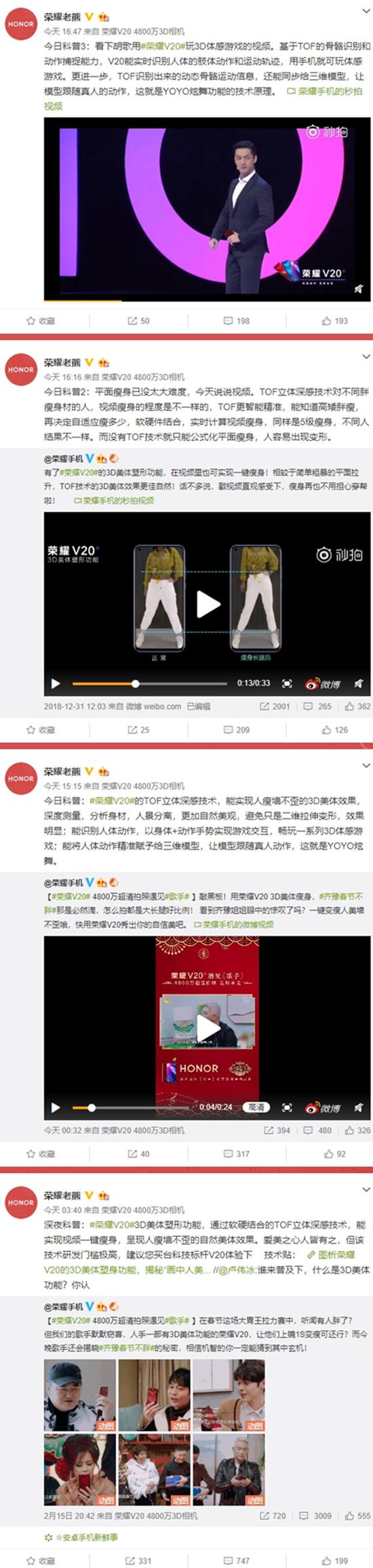关于TOF的应用,荣耀老熊科普了多条微博,从3D美体塑形、视频瘦身到3D体感游戏等等,都体现了荣耀在TOF领域应用的领先优势。