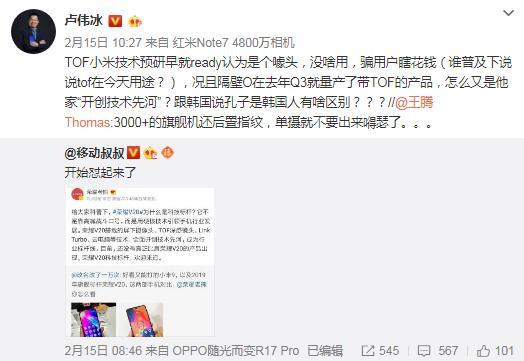 老熊的这番回复,引起了小米高管卢伟冰的不满,他认为TOF只是个噱头,骗用户瞎花钱。