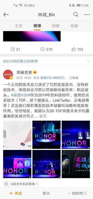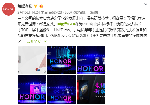 针对小米高管卢伟冰对荣耀V20 TOF相机的质疑,荣耀老熊回应称,一个公司的技术实力决定了它的发展走向,没有研发技术,很容易会习惯以营销眼光看世界:都是噱头。他还认为,3D TOF将是未来手机最重要的发展方向之一。