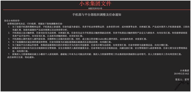 2月18日,小米集团今日发布关于手机部和平台部组织调整通知:手机部成立参谋部,任命朱磊为参谋长,负责手机业务销售运营、业务运营分析等业务;手机部成立显示触控部,核心器件部并入硬件研发部;原集团安全部拆分为安全合规部和安全管理部。