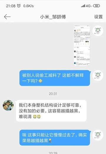 针对此事,有网友在微博私信询问小米公司新媒体高级工程师@小米_邹师傅,称“被别人说偷工减料了,这都不解释一下吗”,得到的回答是“我们本身整机结构设计足够可靠,没有加的必要,这容易越描越黑,难说清。”