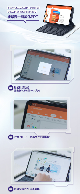说到做PPT时的“老大难”工作,美化排版首当其冲。大篇幅的文字、各种配图……如何在不失美观的前提下逼格满满,让人看着“神清气爽”?华为MatePad Pro所搭载的WPS拥有智能排版功能,一招帮你轻松搞定。打开“设计”一栏中的“智能排版”,即可“一键美颜”,呈现心有所想的排版。有了智能排版功能,以后再也不用为美化PPT左右为难了。