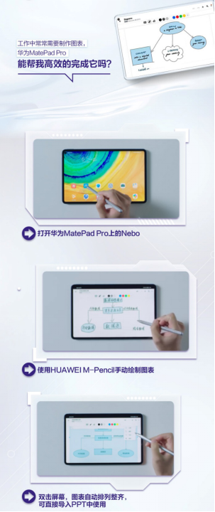 做PPT时,如何轻松get自己心有所想的图表呢?虽然PPT软件上自带一些图表模板,但并不是所有的模板都合我们的心意。如果你使用华为MatePad Pro,完全无需担心这个问题。打开华为MatePad Pro上的Nebo软件,使用HUAWEI M-Pencil就可以手动绘制各种图表了,当你双击屏幕时,图表可以自动排列整齐,直接导入PPT就可以直接使用了,方便又快捷。