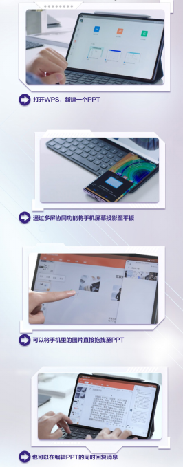 做PPT时,可能会用到手机上的一些配图。如果通过微信等第三方工具传输,简直是浪费时间,但是华为MatePad Pro的多屏协同功能则可以把手机里的图片直接拖拽至平板电脑上。只要手机和平板建立连接,就可以完成这一操作。多屏协同还有一个地方值得称赞,就是手机可以“分身”至平板上。当我们全身心的投入做PPT时,可能会错过微信上的重要消息,但当你的手机“分身”至平板上时,就可以在编辑PPT的同时回复微信上的消息了,一举两得。
