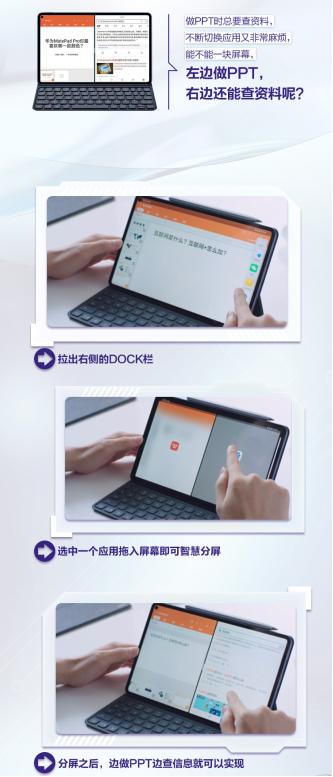 做PPT时,查找资料是在所难免的,在查找资料界面、PPT编辑界面频繁切换常常让大家感到力不从心。现在,华为MatePad Pro的智慧分屏功能帮你完美解决这一问题。在华为MatePad Pro屏幕右侧的DOCK栏,选中一个应用即可实现智慧分屏,可以最多拖出三个应用。这样一来,就可以对照着资料查找界面编辑PPT了,即使再增加一个应用界面也能轻松应对,让工作效率得到质的提升。