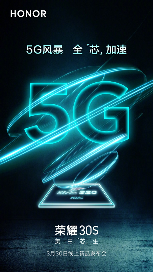今天上午,荣耀官方宣布,3月30日发布的荣耀30S将采用新一代麒麟820 5G芯片。从宣布的海报里面提及到“5G风暴”,或许暗示荣耀30S基于麒麟820处理器不仅是性能上的提升,5G方面或许有新的突破,整体表现甚至能达到目前旗舰级手机的水平。