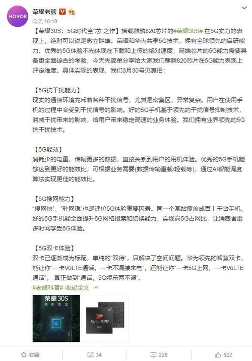早前,荣耀产品经理熊军民曾在微博中提到,搭载麒麟820芯片的#荣耀30S#在5G实力的表现上,绝对可以说是傲立群雄。荣耀和华为共享5G技术,拥有全球领先的自研能力。优秀的5G体验不光体现在下载和上传的绝对速度,高端芯片的5G能力需要具备更全面综合的考验。可见这是一种技术积累的自信,也是对麒麟820芯片5G能力的肯定。而搭载了麒麟820处理器的荣耀30S将是改变5G手机市场竞争格局的一款产品。荣耀营销部副部长关海涛也表示,荣耀30S是一款拥有超能内芯的匠心之作,一款5G时代下的里程碑产品。