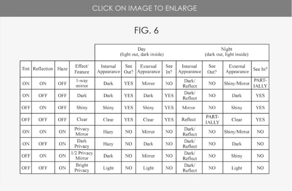 下图是一张表格,其中列出了具有可调色度,雾度和反射率的窗户的说明性窗户设置和相关的光学特性。
