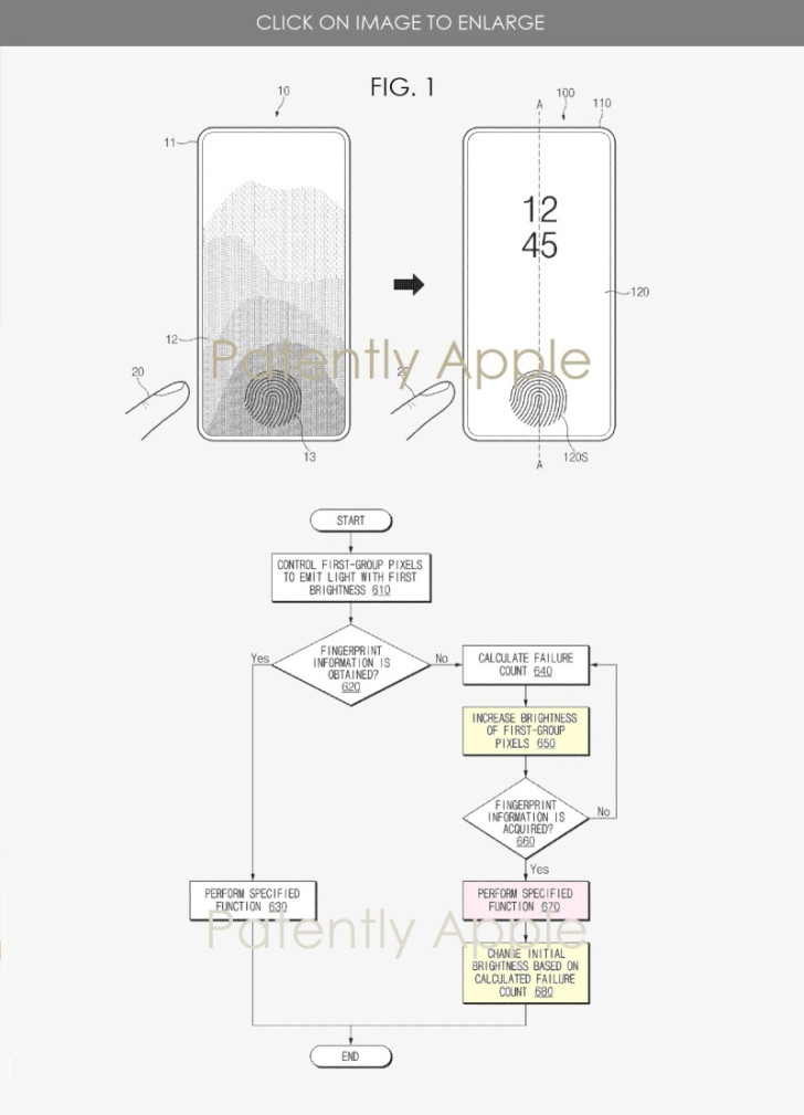 IT之家了解到,由于烧屏跟屏幕的亮度有很大的关系,三星的这个专利给出的解决方案是调整指纹传感器区域屏幕的亮度,当用户的手指与该区域接触时,屏幕先发出 300LUX 的亮度,如果该亮度不足以获取指纹信息,则显示屏可以逐渐增加该区域的亮度,直至获得指纹信息。