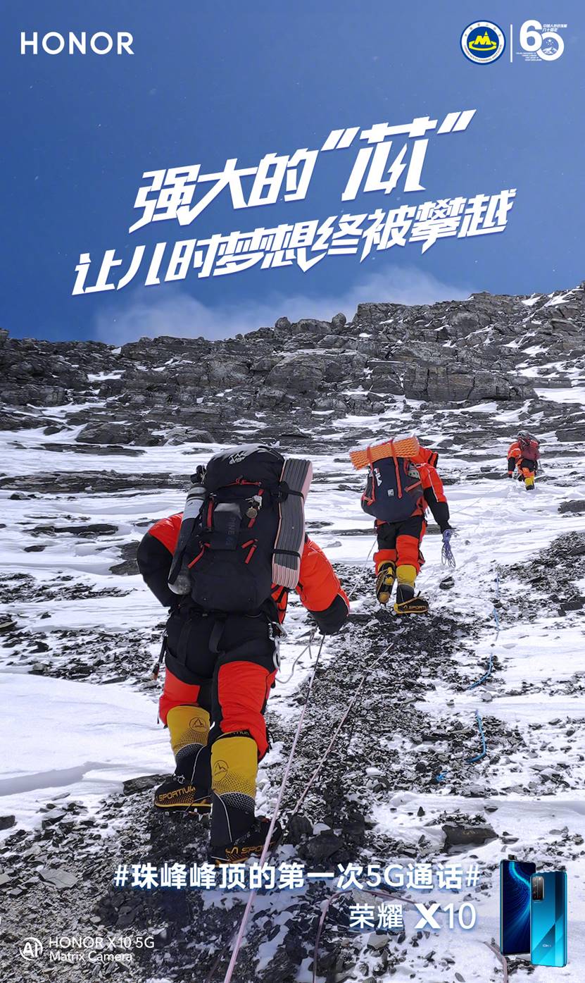 为此,在运营商加大5G网络建设规模的同时,5G手机在全民5G普及中也扮演着至关重要的角色。今年5月,荣耀X10携手中国登山队成功登顶珠峰,并且成功实现珠峰峰顶第一次5G通话,还将沿途拍摄的高清照片和视频利用5G实时回传。