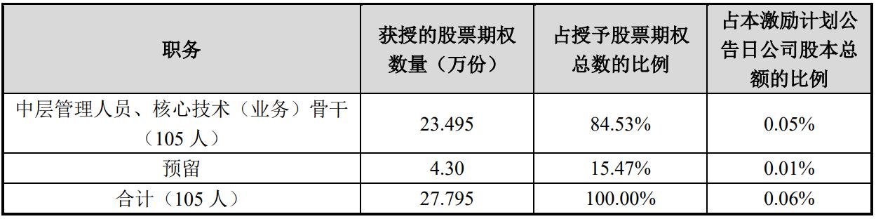 (一)股票期权激励计划:公司拟向激励对象授予27.795万份股票期权,涉及的标的股票种类为人民币A股普通股,占本激励计划公告日公司股本总额45,605.4438万股的0.06%。其中首次授予23.495万份,约占本激励计划公告日公司股本总额45,605.4438万股的0.05%,占本次授予股票期权总量的84.53%;预留4.30万份,约占本激励计划公告日公司股本总额45,605.4438万股的0.01%,占本次授予股票期权总量的15.47%。激励对象获授的每份股票期权在满足行权条件的情况下,拥有在有效期内以行权价格购买1股公司股票的权利。