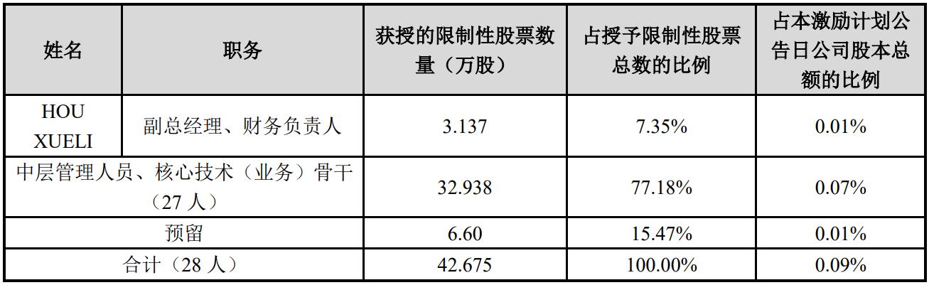 (二)限制性股票激励计划:公司拟向激励对象授予42.675万股限制性股票,涉及的标的股票种类为人民币A股普通股股票,约占本计划草案公告日公司股本总额45,605.4438万股的0.09%。其中首次授予36.075万股,约占本激励计划公告日公司股本总额45,605.4438万股的0.08%,占本次授予限制性股票总量的84.53%;预留6.60万股,约占本激励计划公告日公司股本总额45,605.4438万股的0.01%,占本次授予限制性股票总量的15.47%。