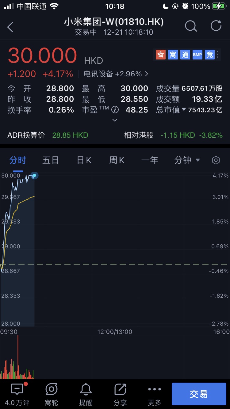港股小米集团(01810.HK)涨超 4.17 %,股价续创新高,报 30.000 港元 / 股,市值达 7543.23 亿港元。这也是小米集团股价首次站上 30 港元关口。