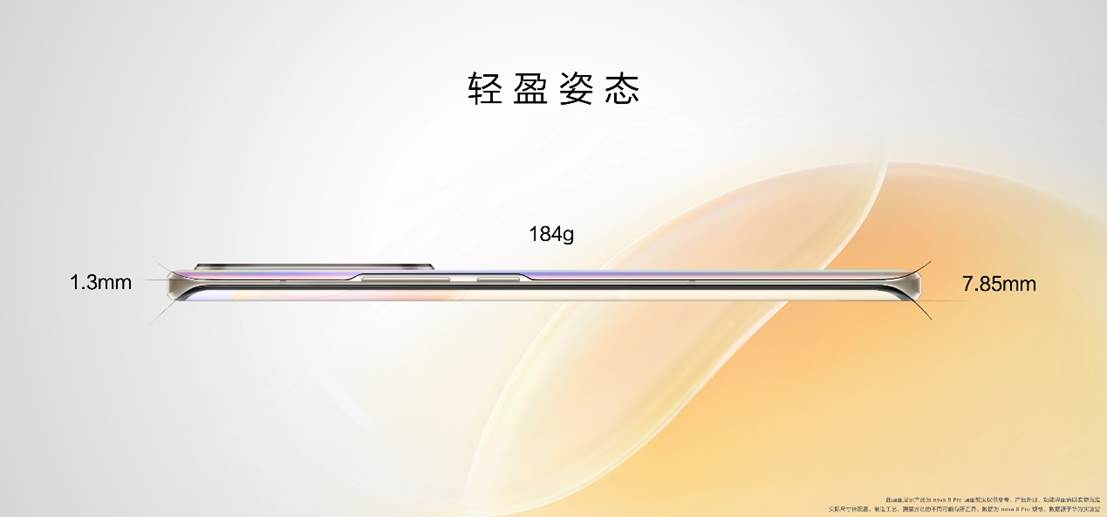 对于年轻人而言,时尚轻薄已成为其对手机等电子产品的基本要求。在nova系列的设计美学中,轻薄是其工艺技术的核心考量因素之一。华为nova8系列采用前后3D双曲面玻璃机身,其中华为nova8机身薄至7.64mm, 重量为169g,华为nova8 Pro机身厚度为7.85mm,重量为184g,在兼具5G性能的同时,带来更轻薄的视觉和舒适握持体验。