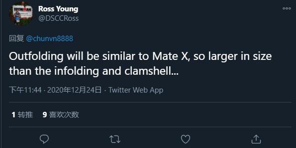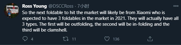DSCC 创始人兼 CEO @Ross Young 今日爆料称,小米有望在 2021 年推出三款折叠屏手机。分别是外折型、内折型和翻盖式,也就是目前主流的三种形态。此外,外折型那款设计类似于华为 Mate X,因此尺寸较其他两款更大。