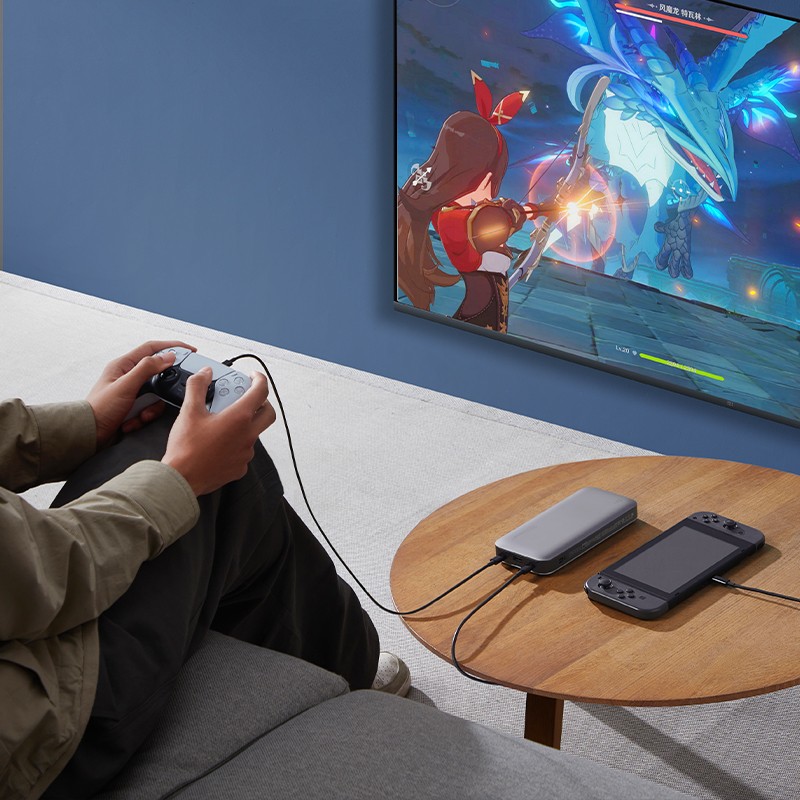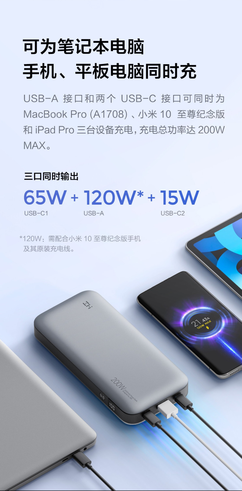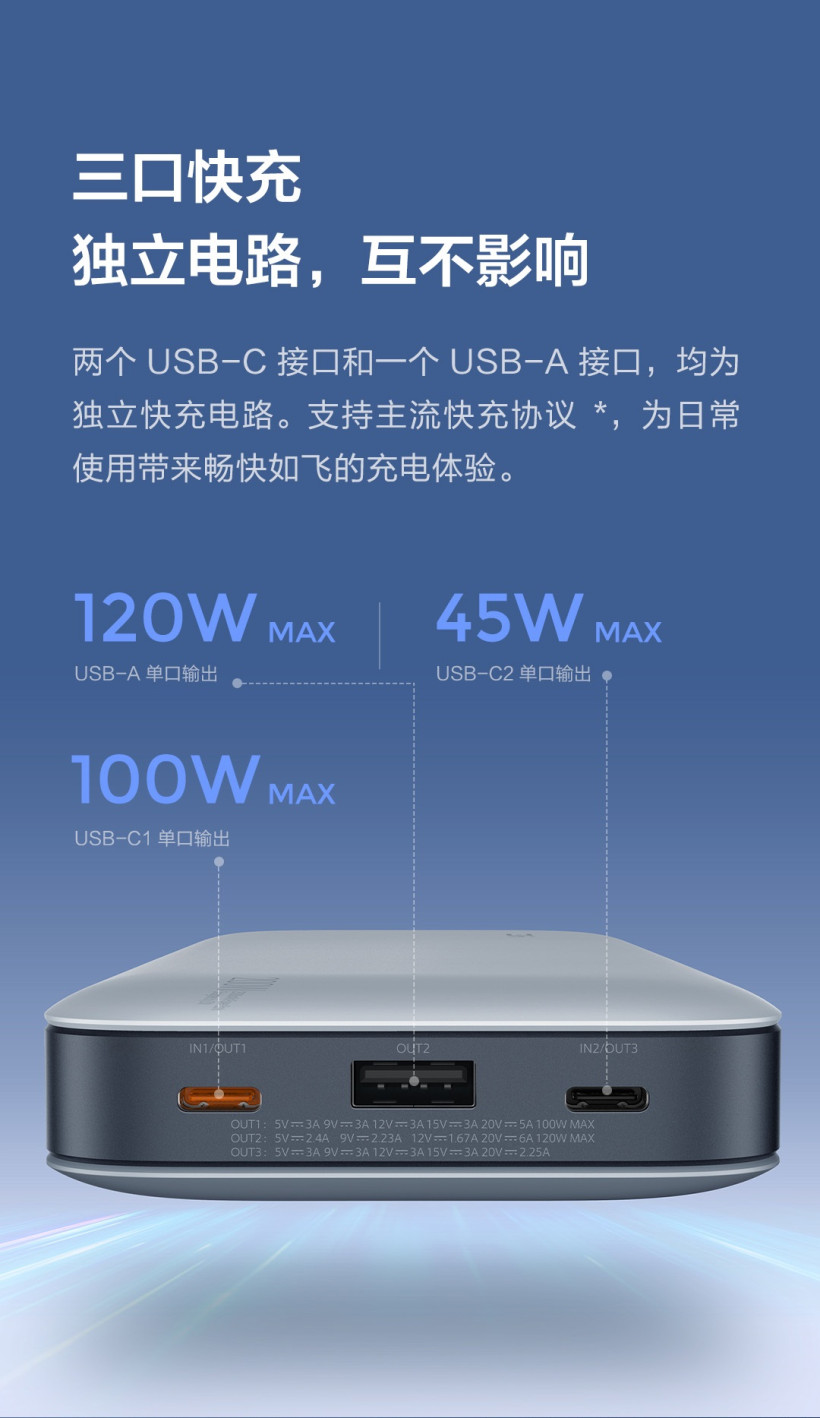 紫米 20 号移动电源提供了两个 USB-C 接口和一个 USB-A 接口,均为独立快充电路。支持多种主流快充协议,可以为笔记本电脑、手机、平板电脑同时充电。