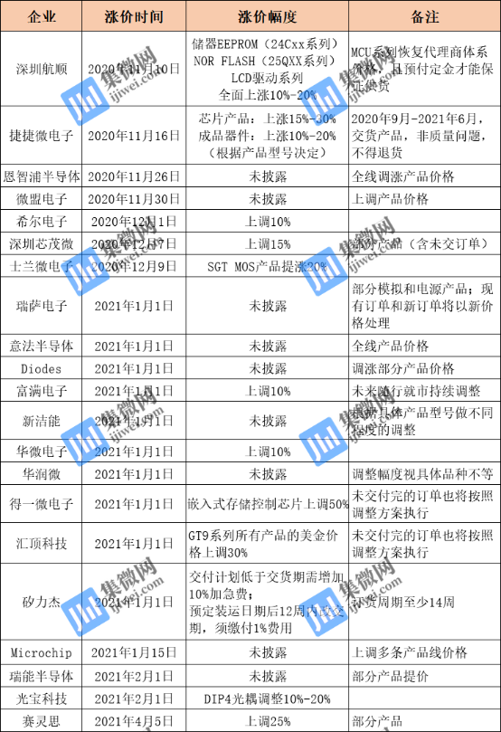 21家芯片企业涨价通知