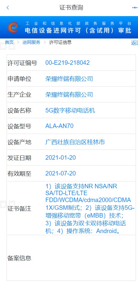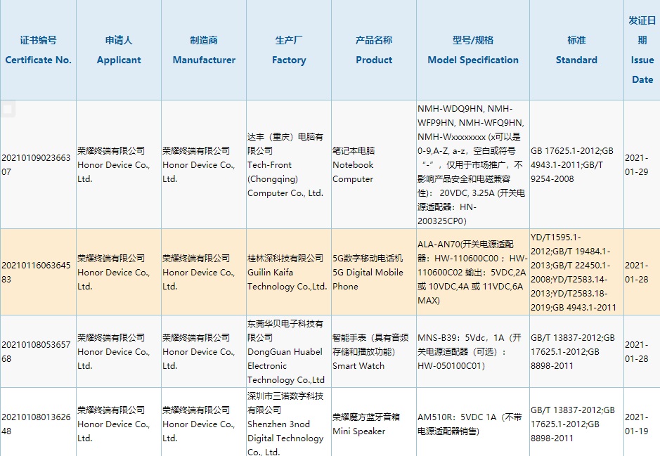 荣耀多款机型现已通过国家 3C 认证,包括一款支持 66W 快充的 5G 手机(ALA-AN70)、一款 5V1A 充电器且可选的智能手表,以及新款 MagicBook 笔记本电脑产品。