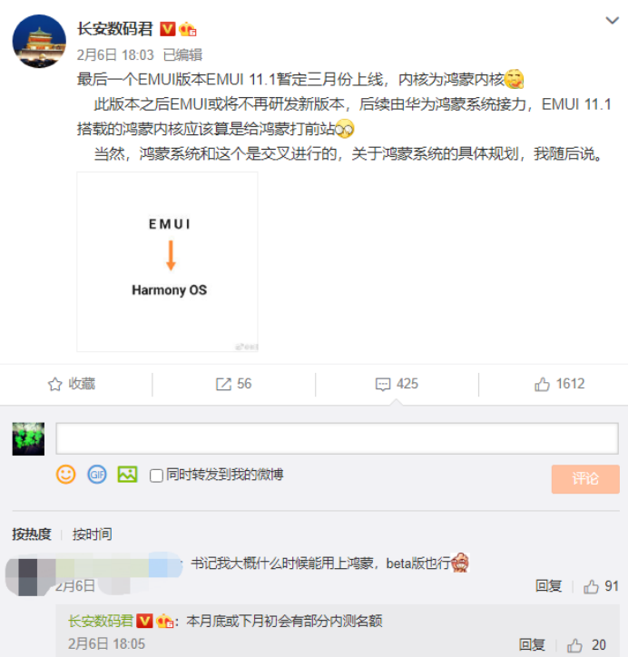 据数码博主@长安数码君爆料,最后一个EMUI版本EMUI 11.1暂定三月份上线,内核为鸿蒙内核。