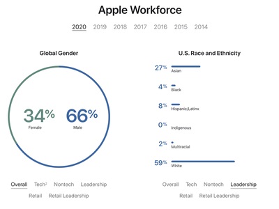 苹果上一次提供员工人数的数据是在 2018 年,苹果将员工多样性细分为公司的不同部门,包括领导层、零售部门和零售领导层。