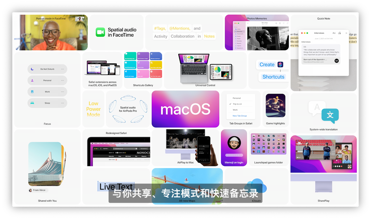 此次macOS的名字为Monterey,将会支持在iOS以及iPadOS中提到的诸如声音聚焦、SharePlay、「与你共享」功能、专注模式、快速备忘录等功能。