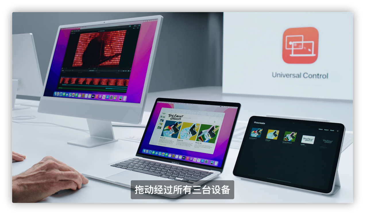在跨设备操作方面,macOS Monterey将支持Universal Control功能。这一功能支持用户在两台或以上的iPad以及Mac之间通过一套鼠标键盘去实现操作。用户只需要把另一台设备放在Mac旁边,就可以使用Mac的光标或键盘对它进行操作,并可以直接进行文件的拖拽。设备之间可以自动识别方向从而实现类似拓展桌面的效果。此外,用户还可以通过隔空播放功能,将内容投射到Mac上进行播放或展示。